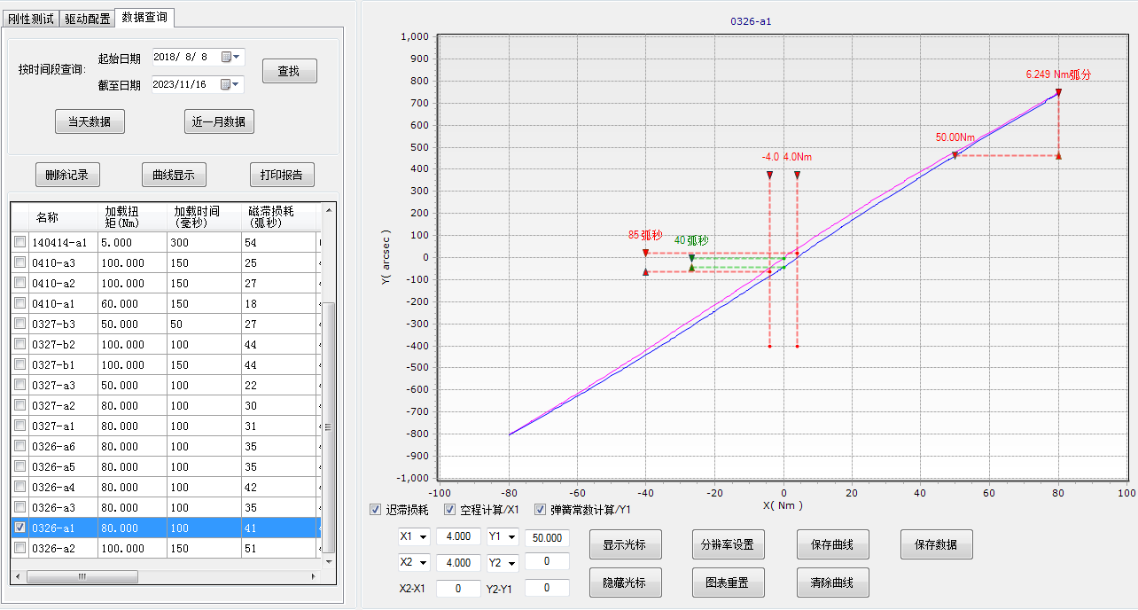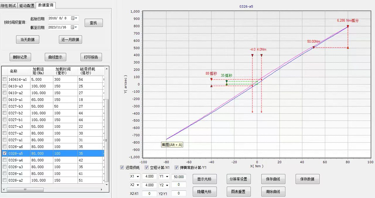 扭轉(zhuǎn)剛度測(cè)試時(shí),滯回曲線(xiàn)上扭矩±3%時(shí)的轉(zhuǎn)角值差,與剛度、空程綜合輸出評(píng)定結(jié)果并繪制滯回曲線(xiàn)。